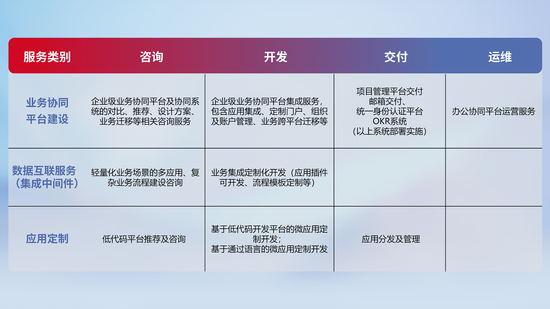 针对钉钉、、、、企微、、IDaas等平台级产品提供产品的规划、、、、方案、、、交付、、、、定制化开发等服务,,,,实现如统一协同办公、、、智能客户服务、、、混合会议管理、、智能数据查询、、等业务场景,,,实现数字化转型。。。